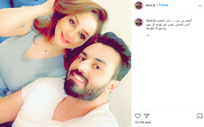 وتغزل زوجها فيها عن طريق نشر صورة لهما عبر حسابه الشخصي بموقع تبادل الصور والفيديوهات "انستجرام"، علق عليها قائلًا:" أتعلم من انت،،انت النعمه التي اغمض عيني في نهايه كل يوم وادعو الا افقدها"، وحرص على إغلاق خاصية التعليقات.