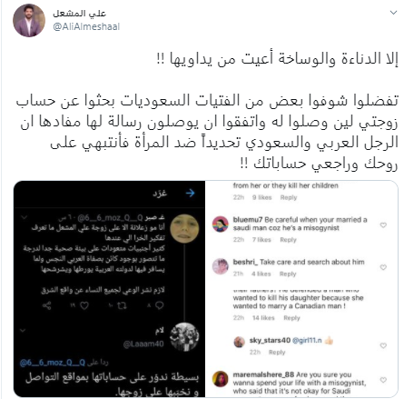 وكتب المشعل تغريدة عبر حسابه الشخصي بموقع التدوينات القصيرة "تويتر":"إلا الدناءة والوساخة أعيت من يداويها!! تفضلوا شوفوا بعض من الفتيات السعوديات بحثوا عن حساب زوجتي لين وصلوا له واتفقوا أن يوصلون رسالة لها مفادها أن الرجل العربي والسعودي تحديدًا ضد المرأة فانتبهي على روحك وراجعي حساباتك!!".