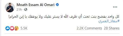 ومن جانب معاذ، علق على هذا الفيديو وهاجم فيه كل من يقوم بفضح أي فتاة، حيث كتب عبر صفحته الشخصية بموقع التواصل الاجتماعي "فيسبوك":"كل واحد بفضح بنت تحت أي ظرف الله لا يستر عليك ولا يوفقك يا ابن الحرام".